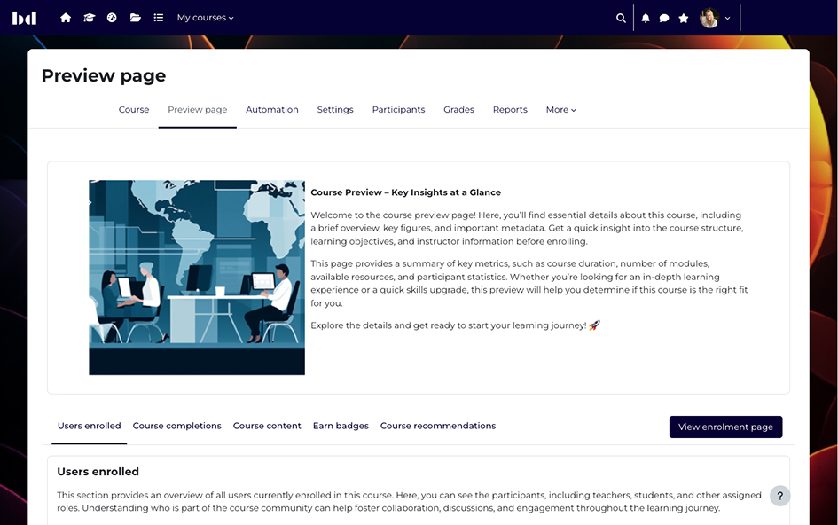Dash offers many additional widgets and data sources that work perfectly on a preview page, such as: Users enrolled, Course completions, Badges earned, Course recommendations, and more. Combined with on-page navigation, you can craft a clean, structured, and interactive preview experience that helps learners understand what your course offers — and invites them to take the next step.